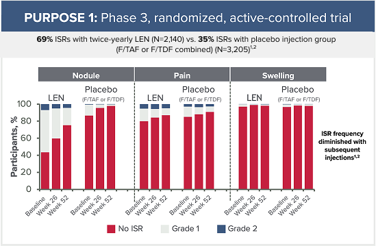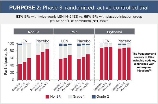3. None of the ISRs in the PURPOSE 1 and PURPOSE 2 trials were serious. Individual results may vary. Advise individuals receiving LEN for PrEP to tell their healthcare provider if they experience any ISRs or other side effects.1