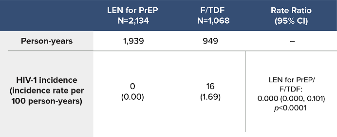 LEN for PrEP demonstrated superiority with a 100% reduction in the likelihood of incident HIV-1 acquisition over F/TDF1