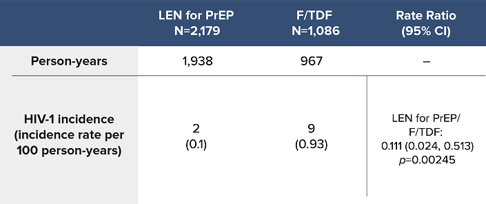 LEN for PrEP demonstrated superiority with an 89% reduction in the likelihood of incident HIV-1 acquisition over F/TDF1