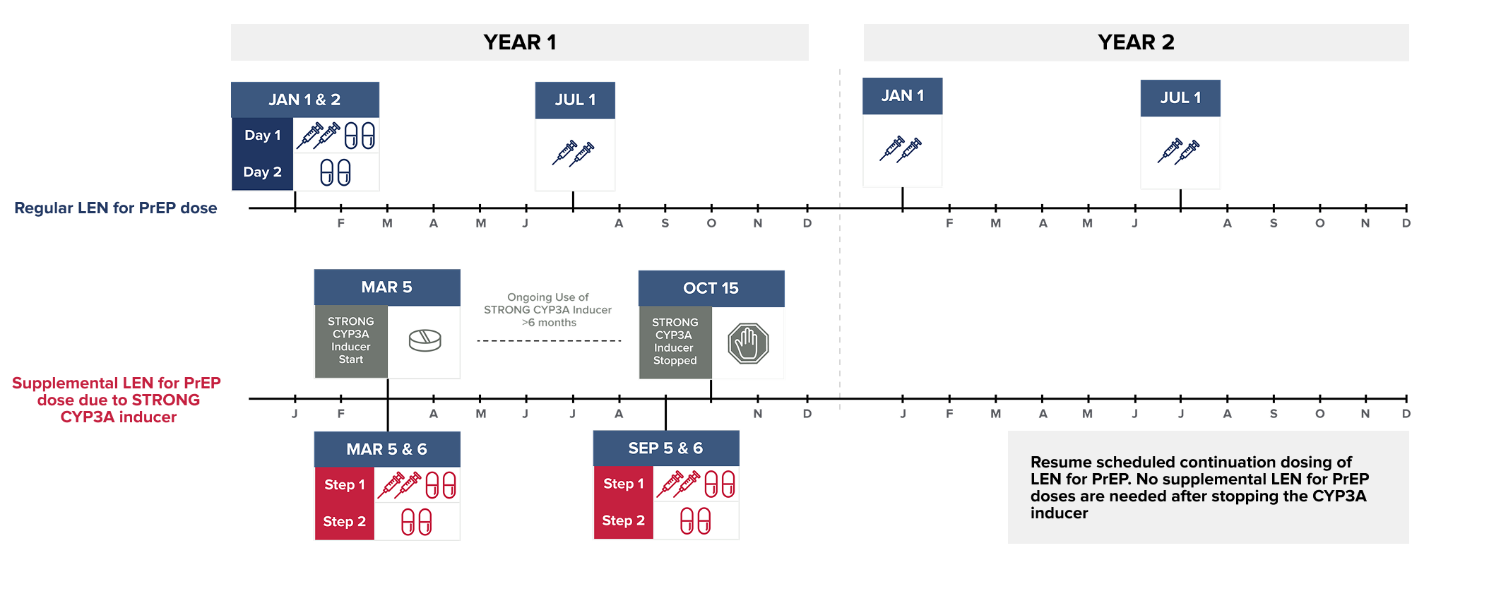 Supplemental doses of LEN for PrEP are recommended in individuals starting a strong or moderate CYP3A inducer. Supplemental doses are given in addition to scheduled continuation LEN for PrEP doses, for as long as the individual remains on the CYP3A inducer.1
