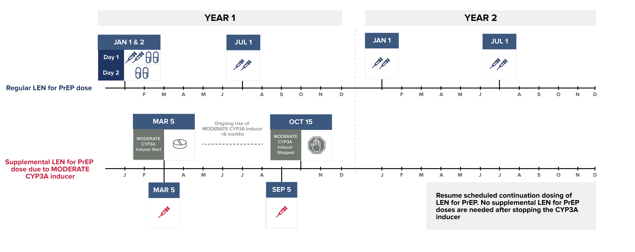 Dosing recommendations are available when strong CYP3A inducers are initiated starting at least 2 days after LEN for PrEP is first initiated; moderate CYP3A inducers may be started any time after LEN for PrEP is first initiated.1